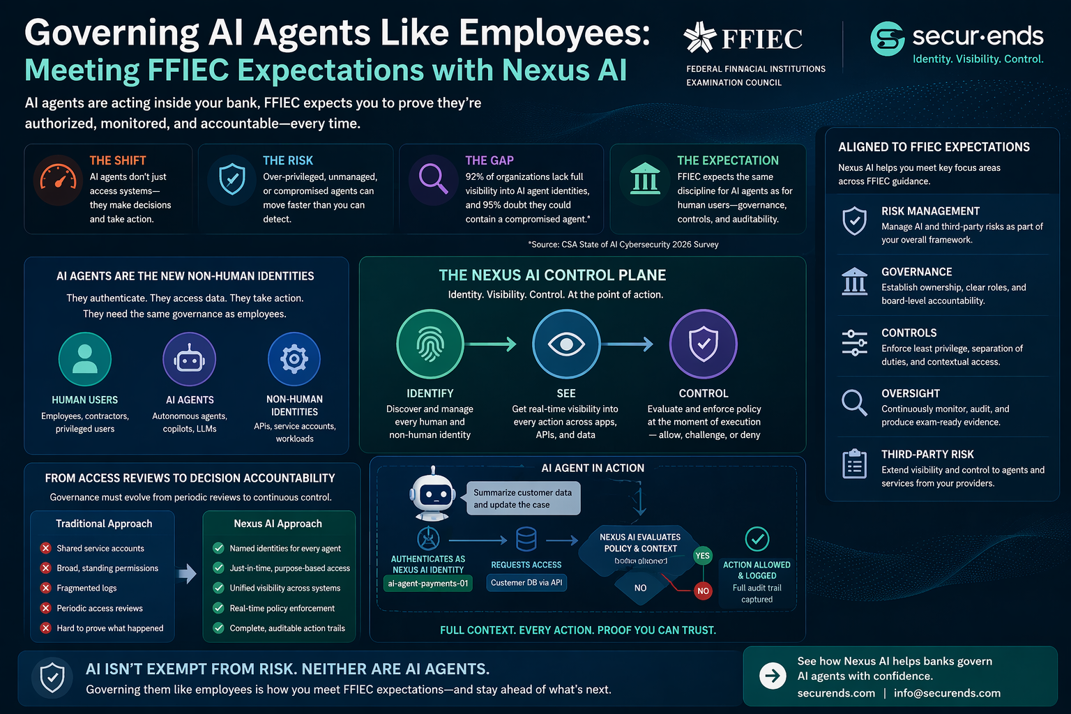 SecurEnds, shared an update Posted4 days AGO AI agents are already acting inside banks. They’re accessing systems, calling APIs, moving data, and triggering workflows—often without clear ownership or accountability. FFIEC isn’t going to ask if it was AI. It’s going to ask: Who acted? What did they do? Why was it allowed? Can you prove it? That’s the shift—from access governance to decision accountability. Read More AI agents are already acting inside banks. They’re accessing systems, calling APIs, moving data, and triggering workflows—often without clear ownership or accountability. FFIEC isn’t going to ask if it was AI. It’s going to ask: Who acted? What did they do? Why was it allowed? Can you prove it? That’s the shift—from access governance to decision accountability. Wrote about how governing AI agents like employees is becoming the only way to meet FFIEC expectations—and how SecurEnds Nexus AI brings identity, visibility, and control together to make that possible. www.linkedin.comGoverning AI Agents Like Employees: Meeting FFIEC Expectations with Nexus AI | Abhi SoodAI agents are already acting inside banks. They’re accessing systems, calling APIs, moving data, and triggering workflows—often without clear ownership or accountability. FFIEC isn’t going to ask if it was AI. It’s going to ask: Who acted? What did they do? Why was it allowed? Can you prove it? That’s the shift—from access governance to decision accountability. Wrote about how governing AI agents like employees is becoming the only way to meet FFIEC expectations—and how SecurEnds Nexus AI brings identity, visibility, and control together to make that possible.www.linkedin.comSecurEnds | LinkedInSecurEnds | 4,674 followers on LinkedIn. Identity - Security - Governance - Compliance - Zero-Trust Software | SecurEnds is a modern Identity Security & Governance company helping enterprises secure access across human, machine, and AI-driven identities in today’s hybrid, cloud-first world. Our platform delivers smart identity governance by unifying identity lifecycle management, access certifications, policy enforcement, and audit-ready compliance—while extending zero trust principles to non-human identities, APIs, cloud services, and emerging AI agents. Trusted by organizations across financial services, healthcare, manufacturing, and technology, SecurEnds enables security and compliance teams to: Govern access with clarity and confidence Reduce identity-related risk across users, applications, and infrastructure Meet regulatory requirements with continuous visibility and automated controls Scale identity programs without operational friction Built for security leaders who demand both depth and simplicity, SecurEnds combines enterprise-grade governance with an intuitive experience—designed to adapt as identity landscapes evolve. Read Less
