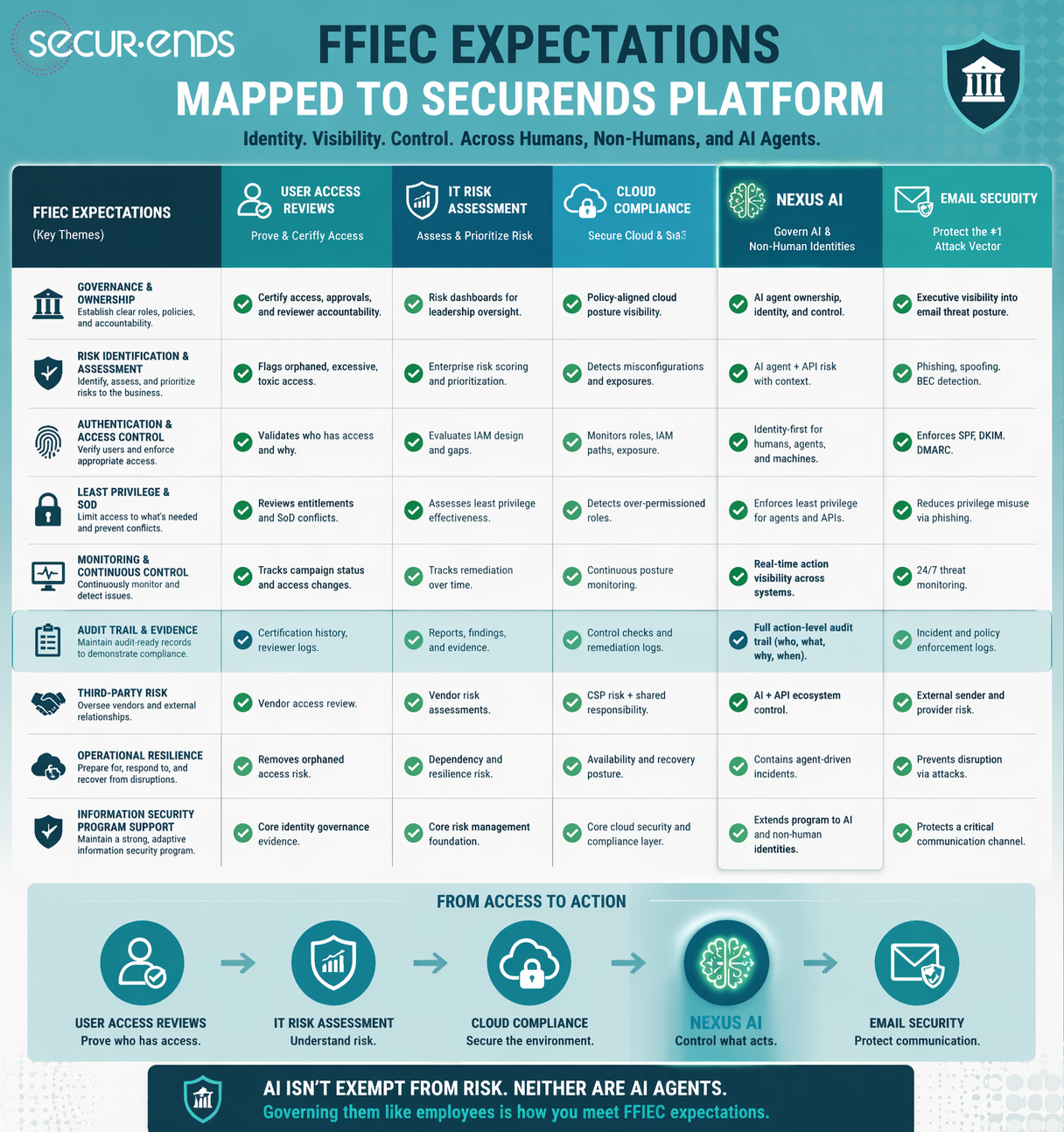 SecurEnds, shared an update PostedFriday, March 27, 2026 at 12:24 PM User Access Reviews Are How FFIEC Expects Least Privilege to Be Maintained FFIEC guidance emphasizes periodic review and validation of user access based on risk. In practice, most community banks complete user access reviews across core systems, Active Directory, and applications. The challenge is not completion. It is whether reviewers understand what they are approving. Core banking permissions,... Read More User Access Reviews Are How FFIEC Expects Least Privilege to Be Maintained FFIEC guidance emphasizes periodic review and validation of user access based on risk. In practice, most community banks complete user access reviews across core systems, Active Directory, and applications. The challenge is not completion. It is whether reviewers understand what they are approving. Core banking permissions, AD group memberships, and application access are often reviewed in isolation, without full context. SecurEnds delivers user access reviews by: Aggregating access across core banking, AD, and connected systems Presenting user, role, entitlements, and business context in one place Enabling reviewers to make approve/revoke decisions with clarity This aligns access reviews with FFIEC expectations by making them informed and defensible. https://www.securends.com/user-access-reviews-and-access-control-built-for-ffiec-examinations/ www.securends.comFFIEC User Access Reviews & Identity Governance | SecurEndsAutomate FFIEC user access reviews with SecurEnds. Improve compliance, reduce risk, and streamline identity governance for banking audits. Read Less